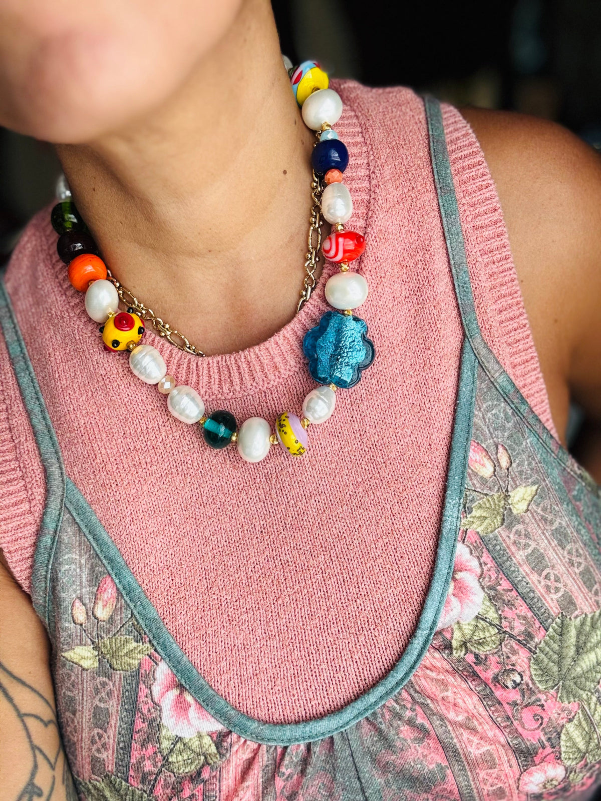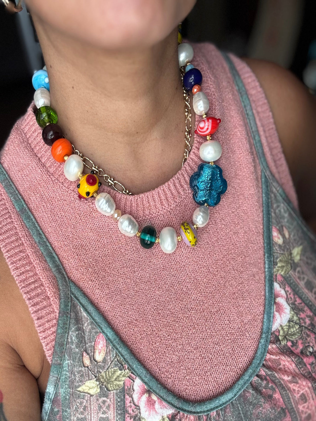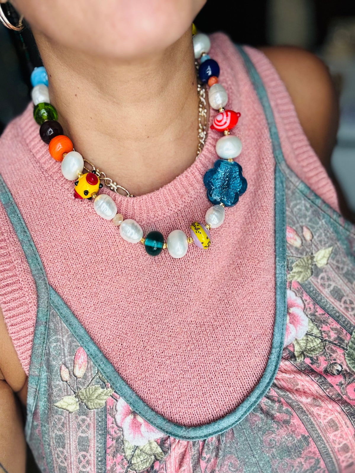 Collar elaborado en perlas nácar satinadas y cristales muranos provenientes de India una pieza espectacular única 18 inch. pieza unica!