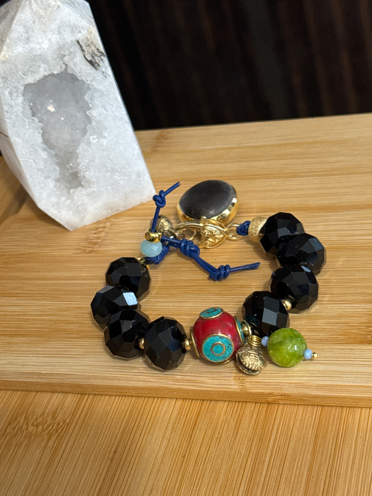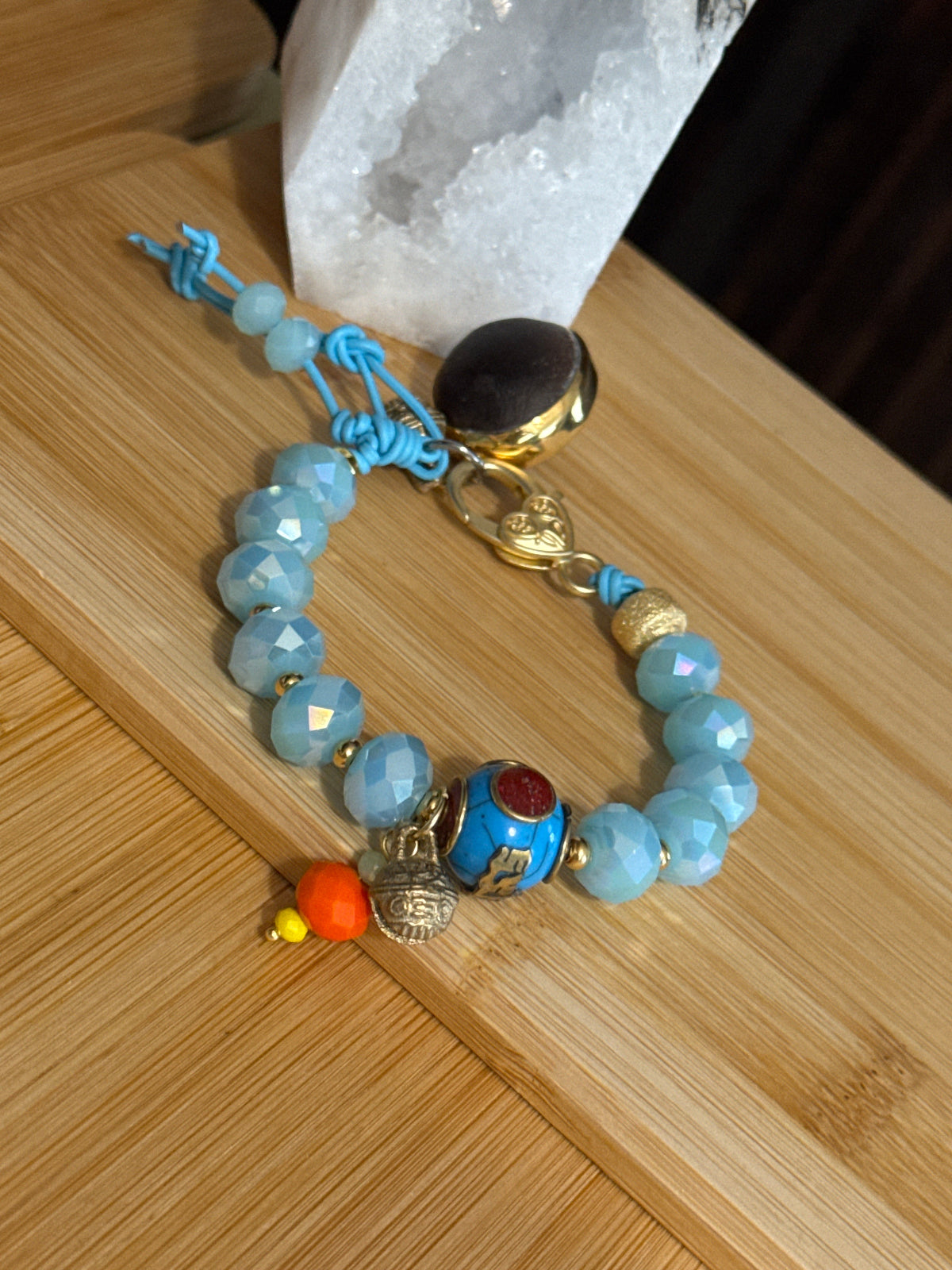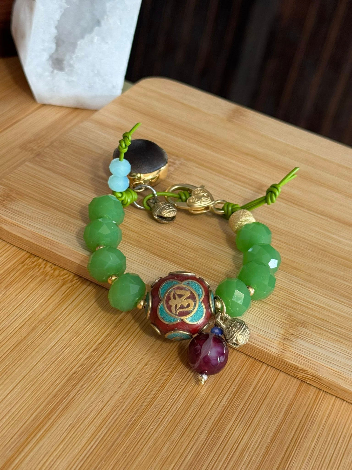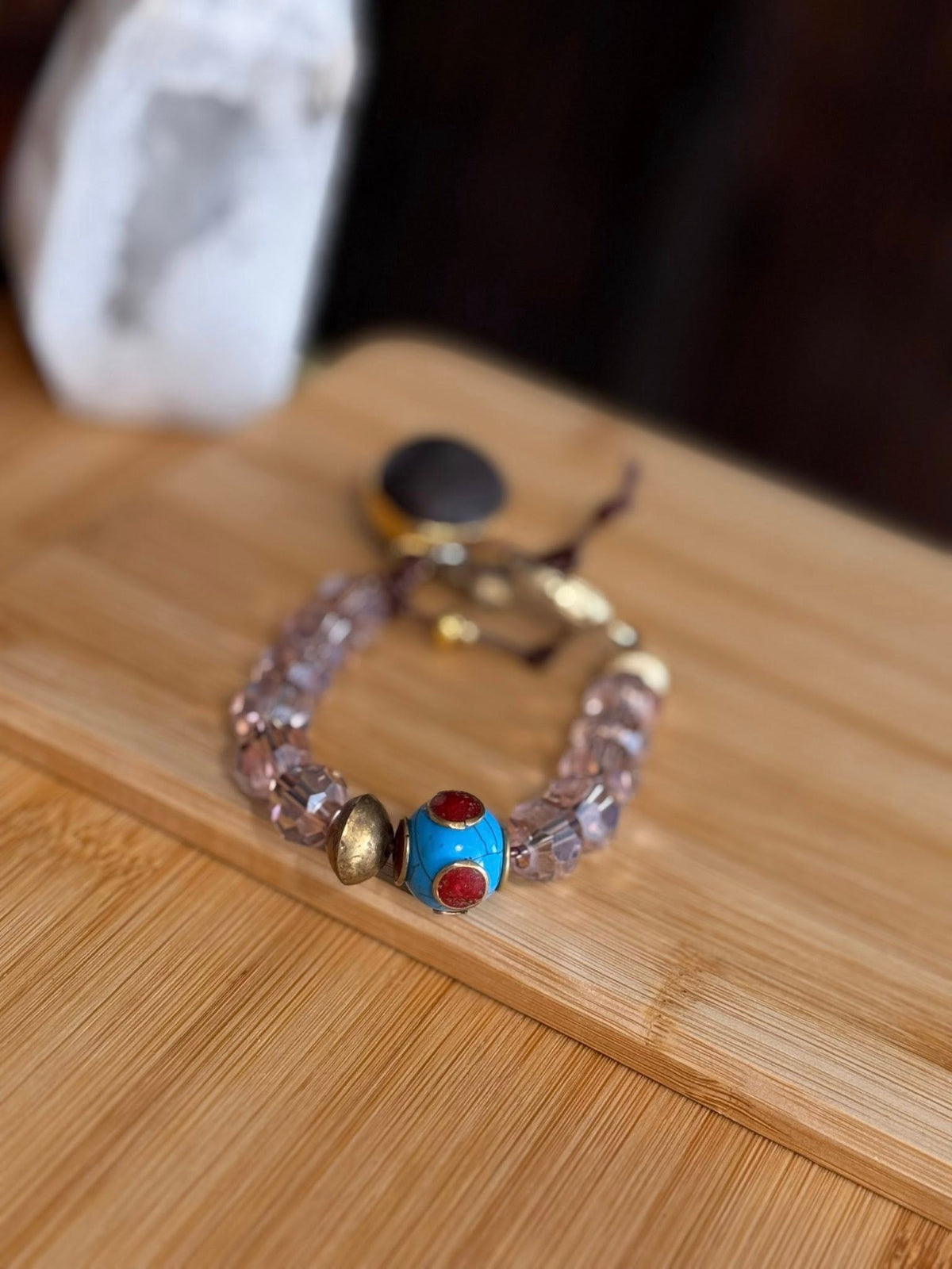 Hermosas pulseras elaboradas en leather tonalidades variadas cristales austríacos facetados swarovskis y como pieza focal centro piezas nepal tibetanas. tamaño ajustable desde 7 a 9...