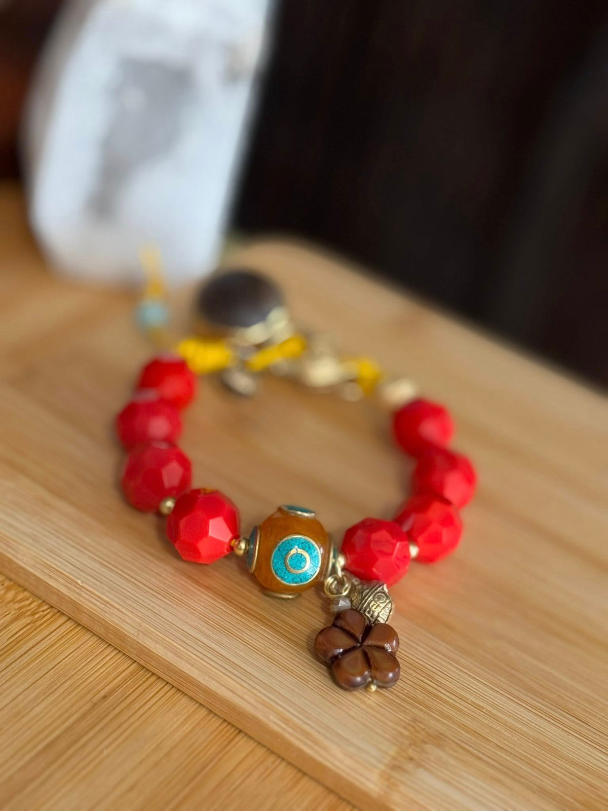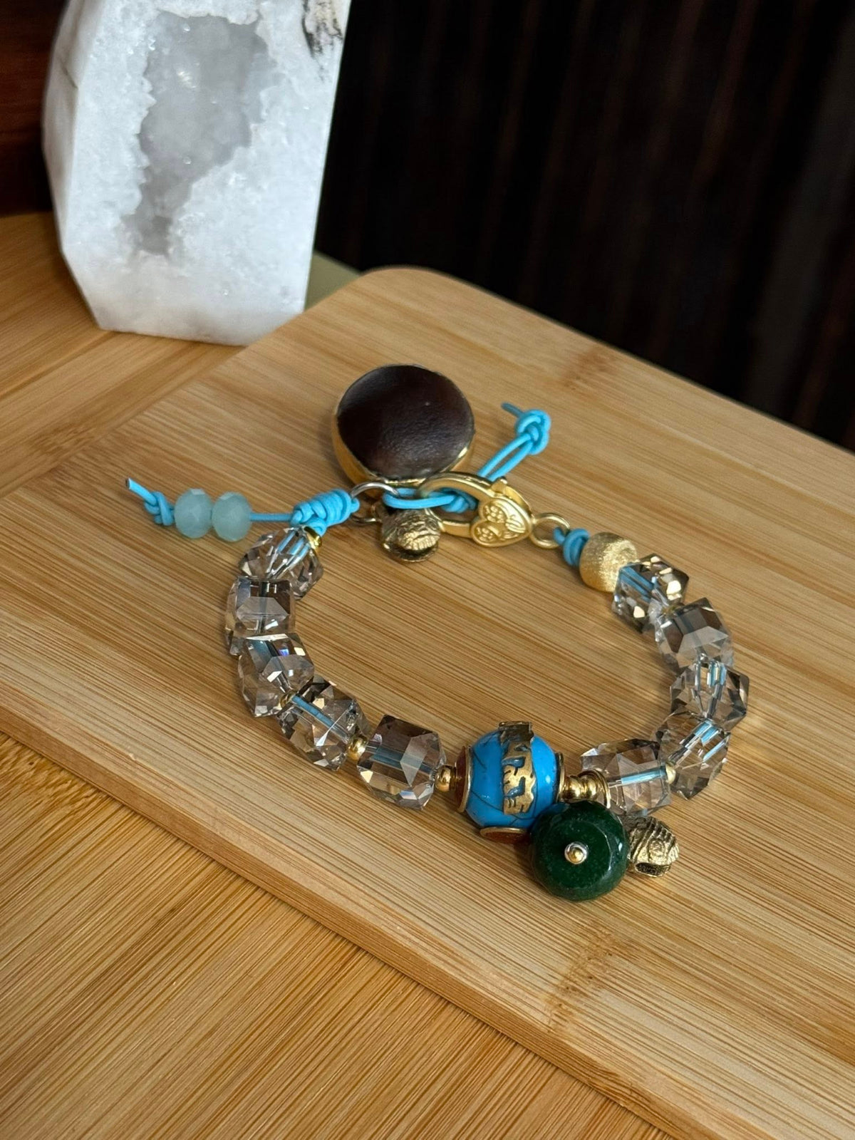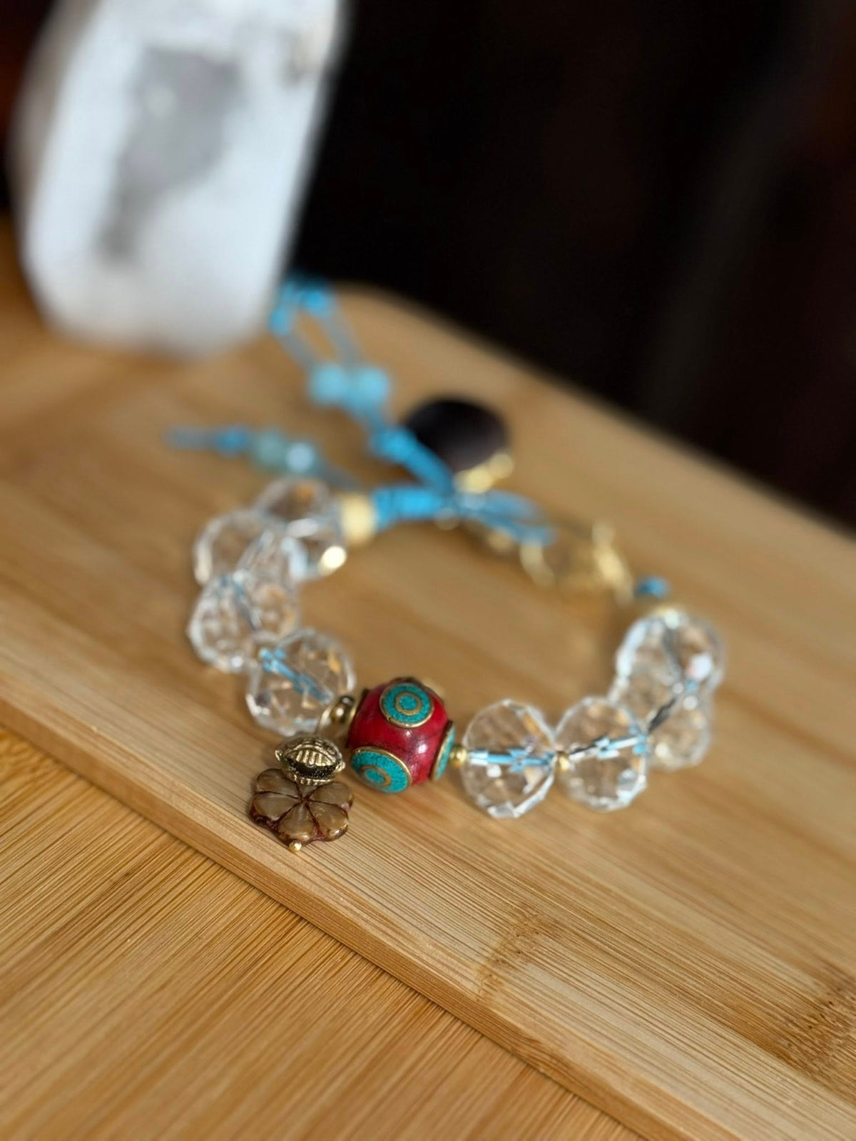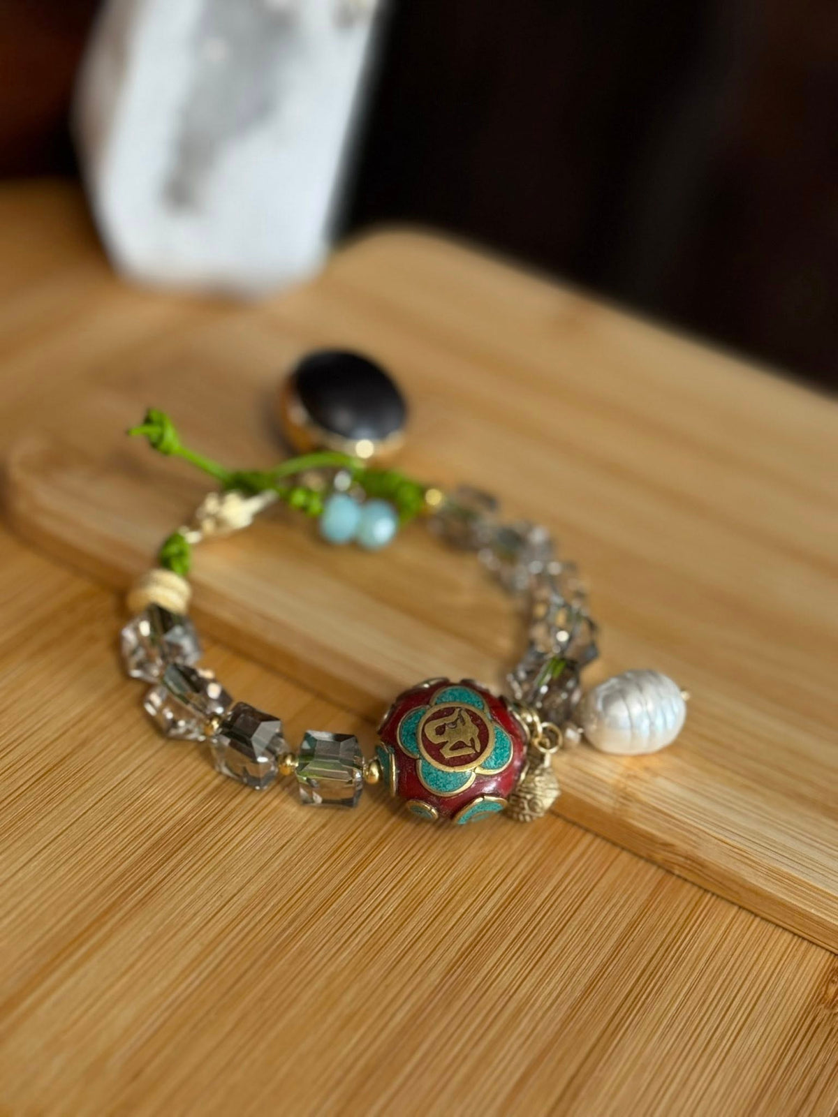 Hermosas pulseras elaboradas en leather tonalidades variadas cristales austríacos facetados swarovskis y como pieza focal centro piezas nepal tibetanas. tamaño ajustable desde 7 a 9...